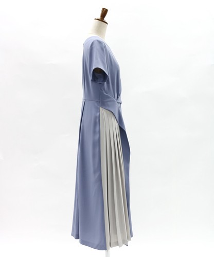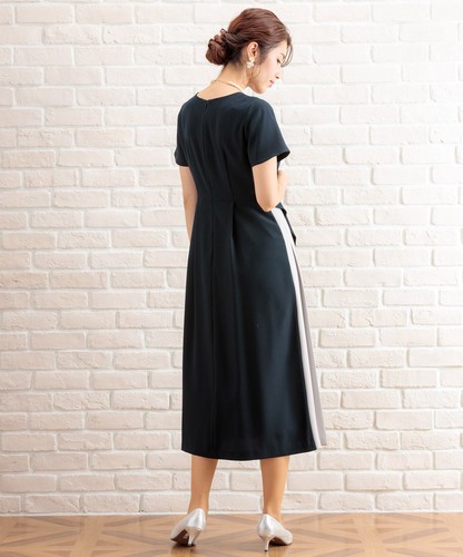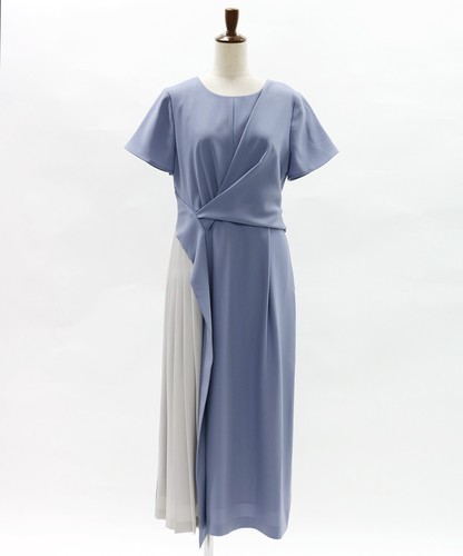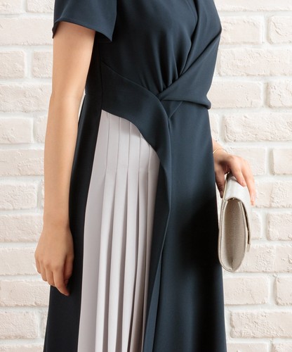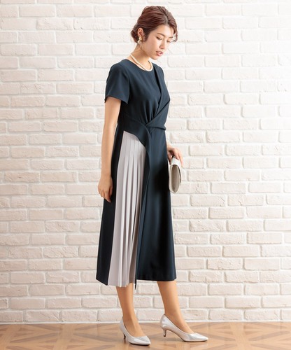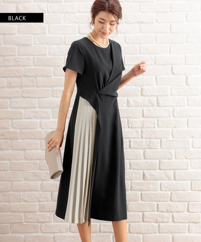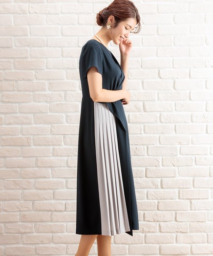 部分プリーツ切り替え配色ワンピースドレス
