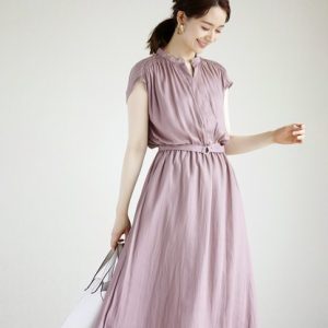 リネン後ろボタン/ボックスプリーツワンピース